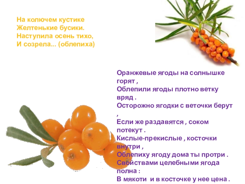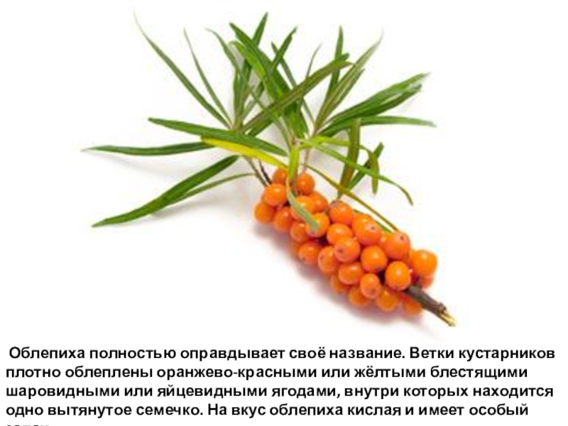 Слайд 146 Облепиха полностью оправдывает своё название. Ветки кустарников плотно облеплены оранжево-красными или