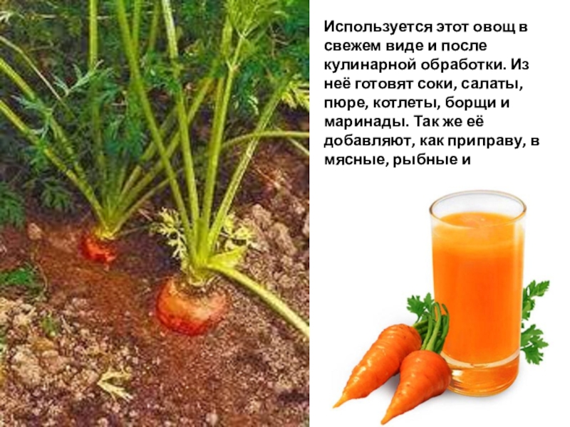 Слайд 16Используется этот овощ в свежем виде и после кулинарной обработки. Из