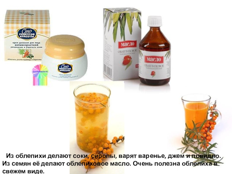 Слайд 148 Из облепихи делают соки, сиропы, варят варенье, джем и повидло.