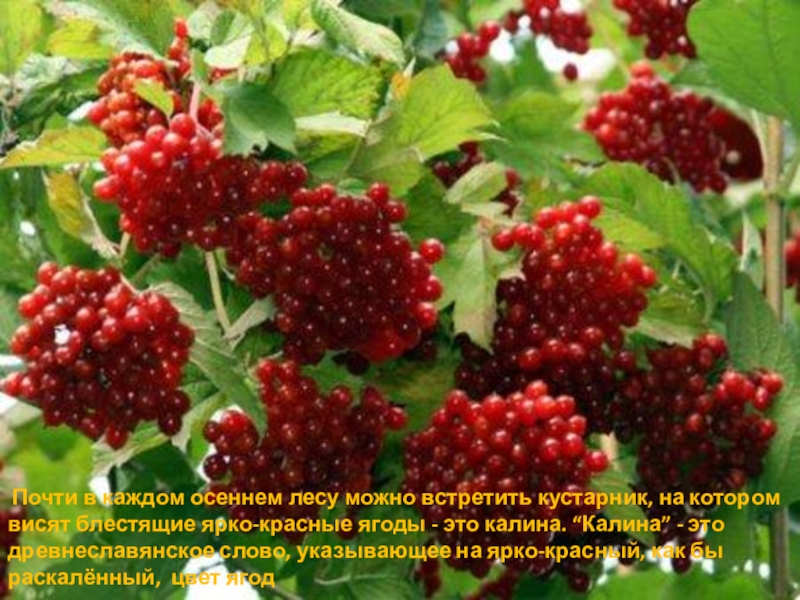 блестящие ярко-красные ягоды - это калина. “Калина” - это древнеславянское слово, указывающее на ярко-красный, как бы раскалённый, цвет ягод