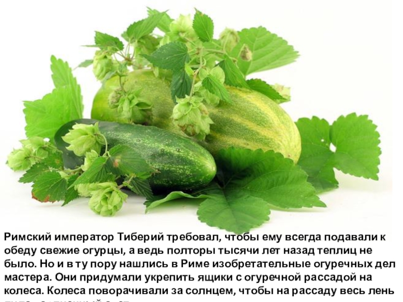 огурцы, а ведь полторы тысячи лет назад теплиц не было. Но и в ту пору нашлись в Риме изобретательные огуречных дел мастера. Они придумали укрепить ящики с огуречной рассадой на колеса. Колеса поворачивали за солнцем, чтобы на рассаду весь лень лился солнечный свет.