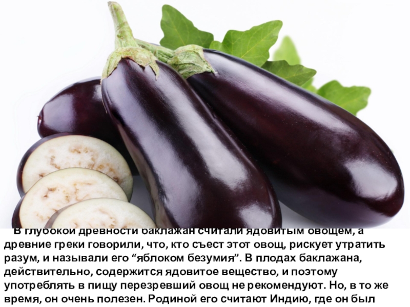 Слайд 18 В глубокой древности баклажан считали ядовитым овощем, а древние греки говорили, что, кто