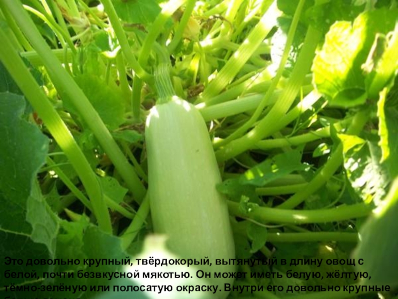 до 70 см. Окраска его чаще всего фиолетовая. Мякоть белая или зеленоватая ,с горьковатым вкусом. Внутри находятся мелкие семена.