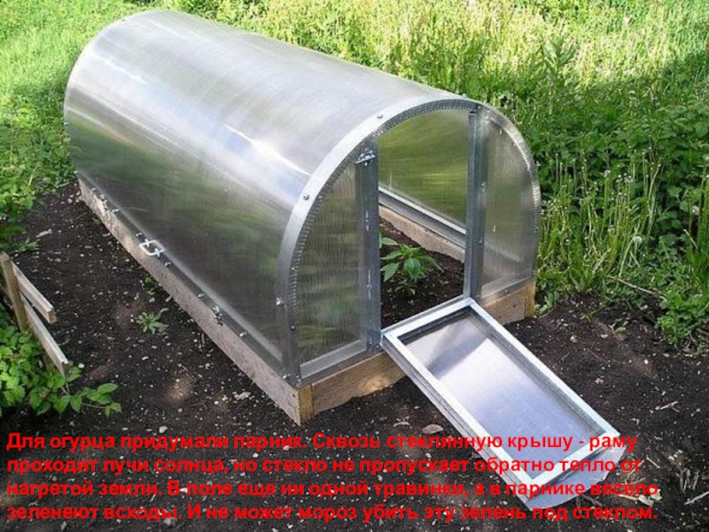 Слайд 7Для огурца придумали парник. Сквозь стеклянную крышу - раму проходят лучи