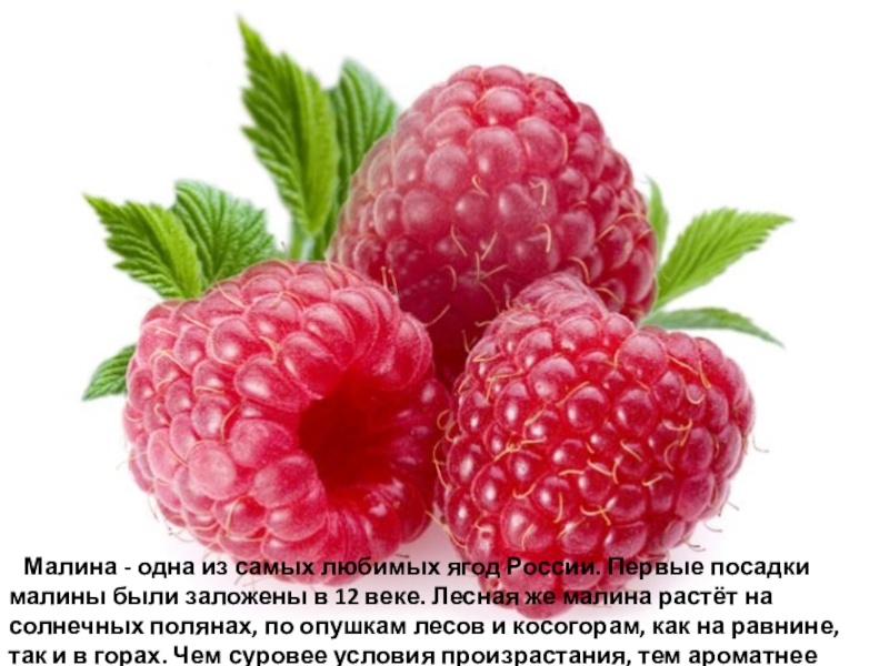 были заложены в 12 веке. Лесная же малина растёт на солнечных полянах, по опушкам лесов и косогорам, как на равнине, так и в горах. Чем суровее условия произрастания, тем ароматнее плоды.
