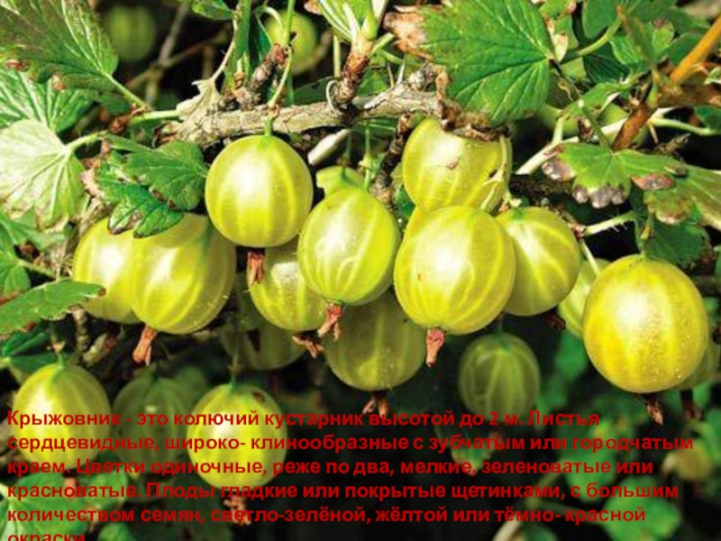 Слайд 152Крыжовник - это колючий кустарник высотой до 2 м. Листья сердцевидные,