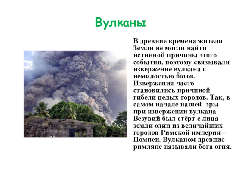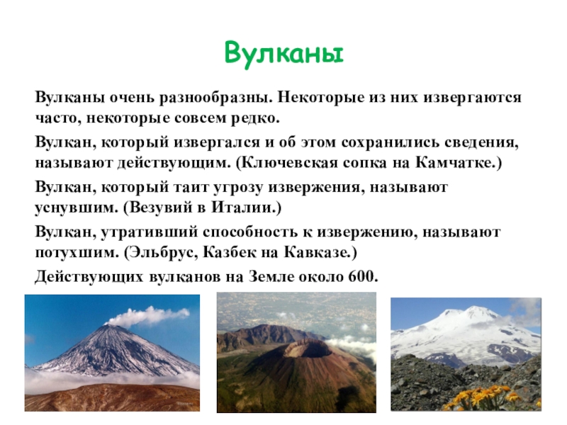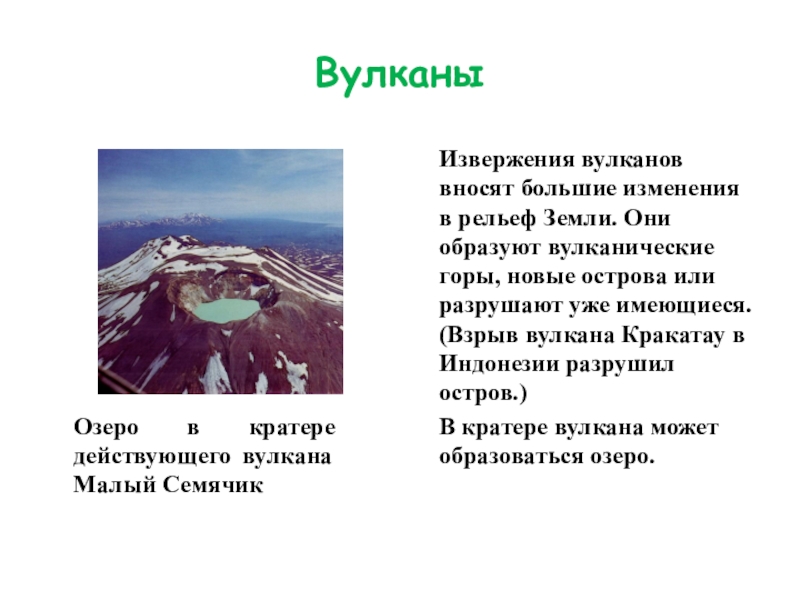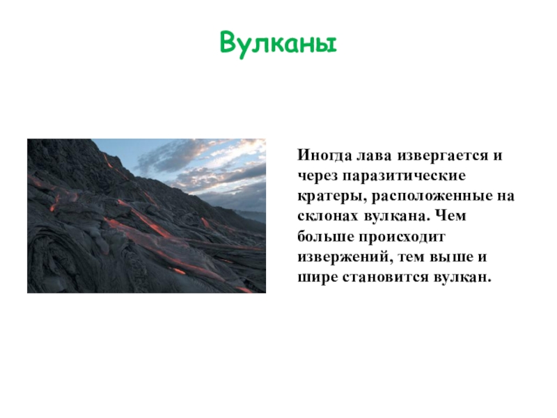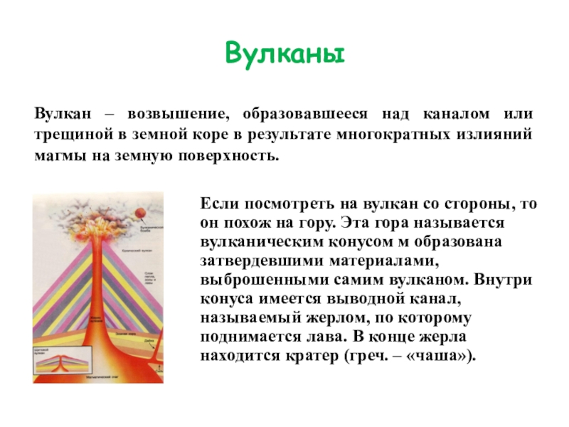 Если посмотреть на вулкан со стороны, то он похож на гору. Эта гора называется вулканическим конусом м образована затвердевшими материалами, выброшенными самим вулканом. Внутри конуса имеется выводной канал, называемый жерлом, по которому поднимается лава. В конце жерла находится кратер (греч. – «чаша»).