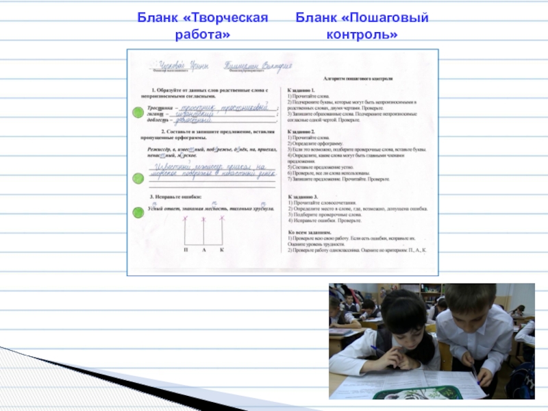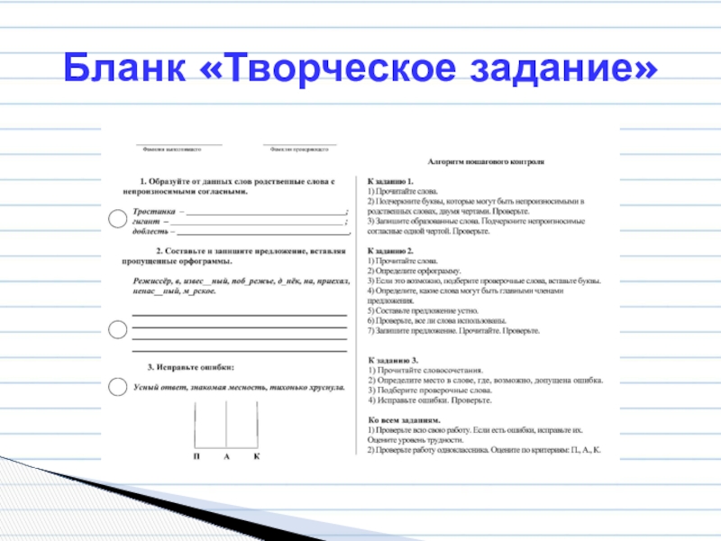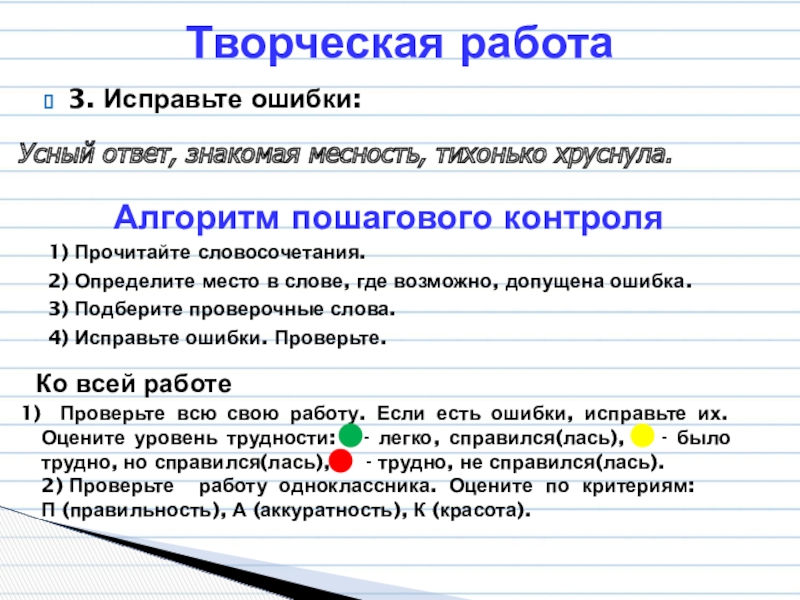 Проверьте всю свою работу. Если есть ошибки, исправьте их. Оцените уровень трудности: - легко, справился(лась), - было трудно, но справился(лась), - трудно, не справился(лась).