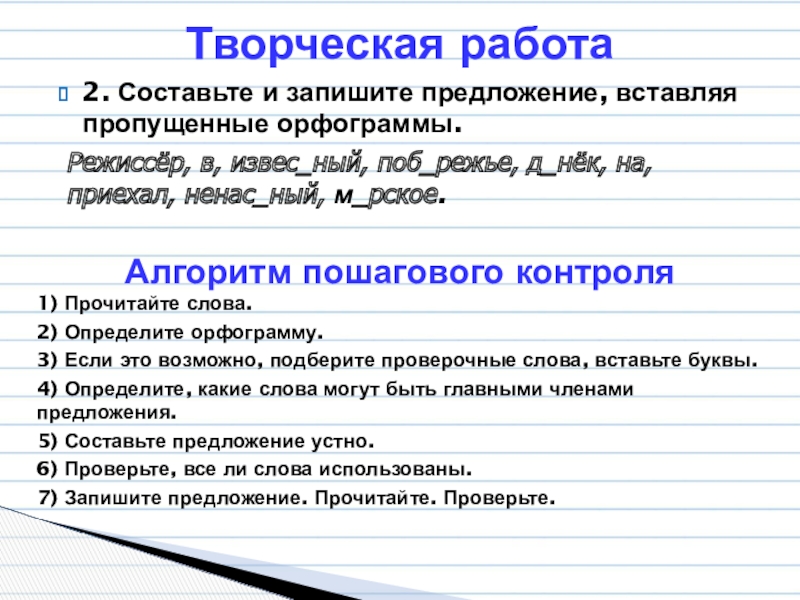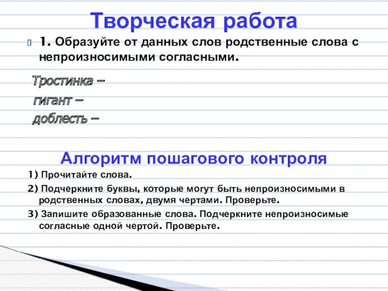 2) Подчеркните буквы, которые могут быть непроизносимыми в родственных словах, двумя чертами. Проверьте.