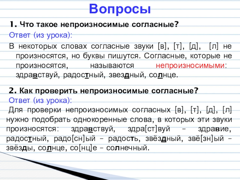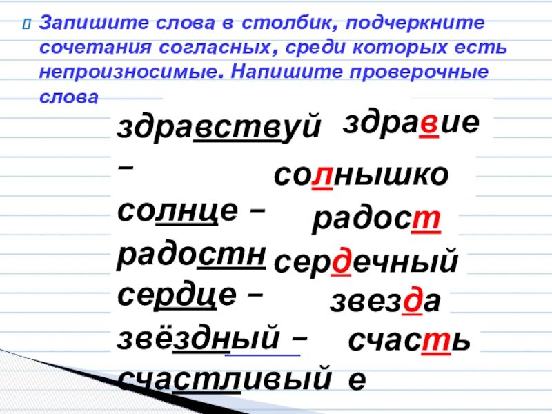 Для проверки непроизносимых согласных [в], [т], [д], [л] нужно подобрать однокоренные слова, в которых эти звуки произносятся: здравствуй, здра[ст]вуй – здравие, радостный, радо[сн]ый – радость, звёздный, звё[зн]ый – звёзды, солнце, со[нц]е – солнечный.