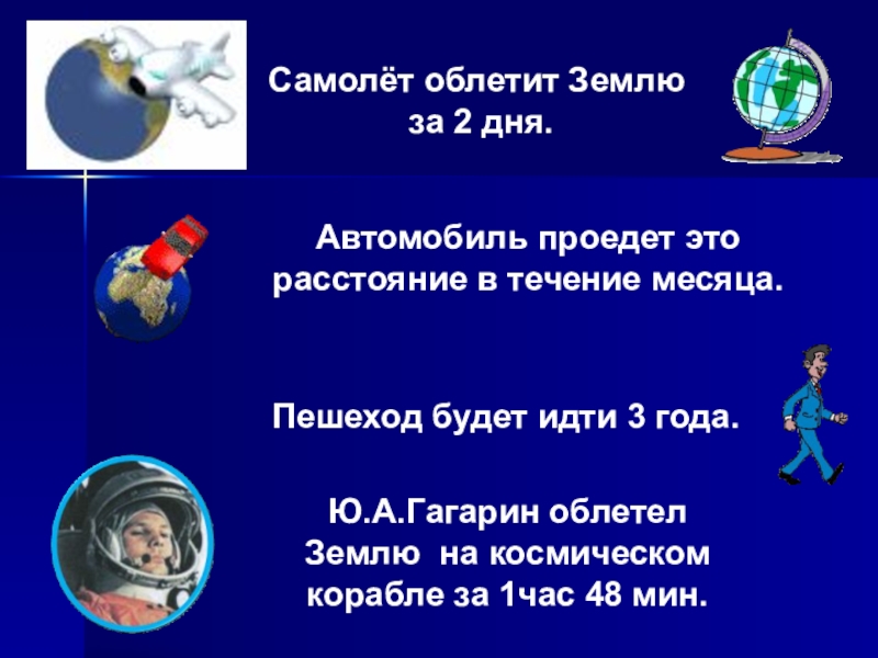 Ю.А.Гагарин облетел Землю на космическом корабле за 1час 48 мин.