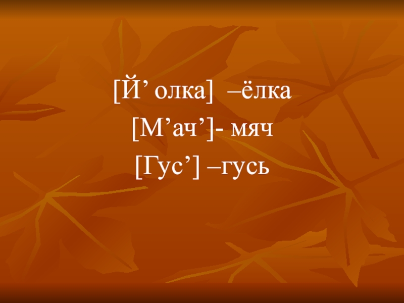 [Й’ олка] –ёлка[М’ач’]- мяч[Гус’] –гусь