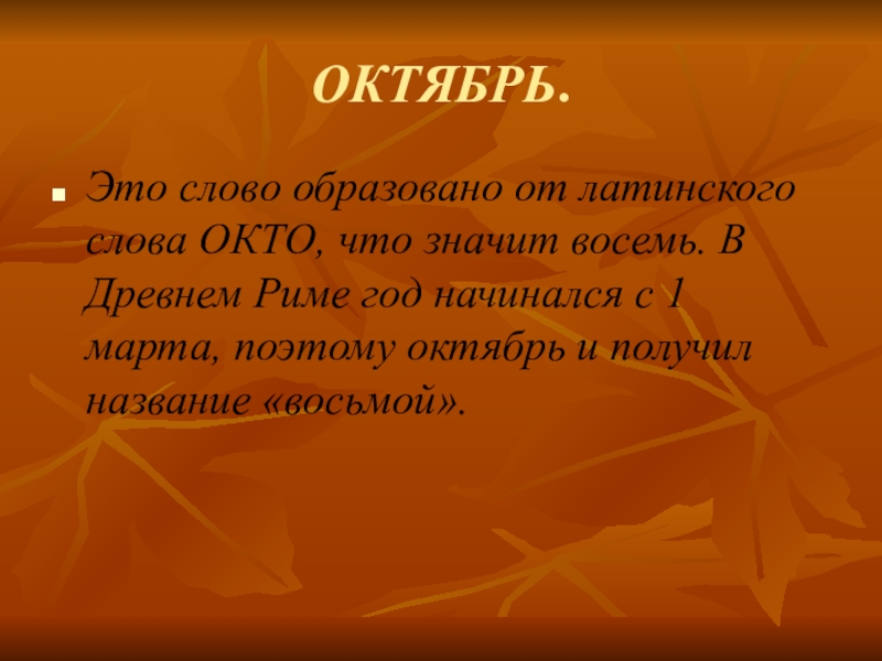 ОКТЯБРЬ.Это слово образовано от латинского слова ОКТО, что значит восемь. В Древнем Риме год начинался с 1