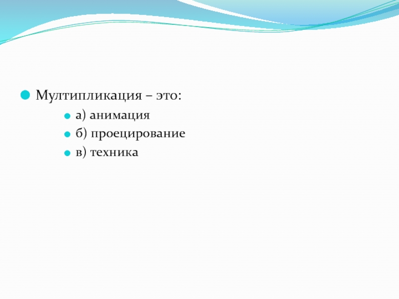 Мултипликация – это:а) анимацияб) проецированиев) техника