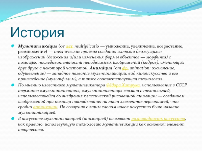 ИсторияМультиплика́ция (от лат. multiplicatio — умножение, увеличение, возрастание, размножение) — технические приёмы создания иллюзии движущихся изображений (движения и/или изменения формы объектов — морфинга) с помощью последовательности неподвижных изображений (кадров), сменяющих друг друга с некоторой частотой. Анима́ция (от фр. animation: оживление, одушевление) — западное название мультипликации: вид