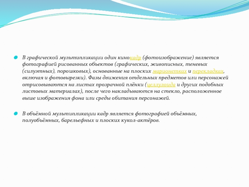 В графической мультипликации один кинокадр (фотоизображение) является фотографией рисованных объектов (графических, живописных, теневых (силуэтных), порошковых),