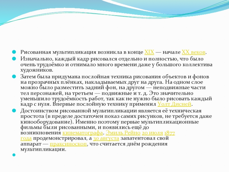 Рисованная мультипликация возникла в конце XIX — начале XX веков.Изначально, каждый кадр рисовался отдельно и полностью, что было очень трудоёмко и