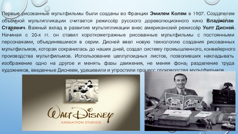 Создателем объемной мультипликации считается режиссёр русского дореволюционного кино Владислав Старевич. Важный вклад в развитие мультипликации внес американский режиссёр Уолт Дисней. Начиная с 20-х гг. он ставил короткометражные рисованные мультфильмы с постоянными персонажами, объединявшиеся в серии. Дисней ввел новую технологию создания рисованных мультфильмов, которая сохранилась до наших дней, создал систему промышленного, конвейерного производства мультфильмов. Использование целлулоидных листов, позволивших накладывать изображение одно на другое и менять фазы движения, не меняя фона; разделение труда художников, введенные Диснеем, удешевили и упростили процесс производства мультфильмов.