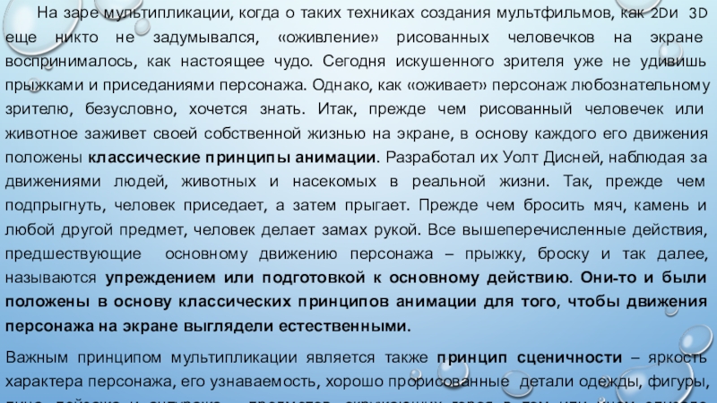 мультфильмов, как 2Dи 3D еще никто не задумывался, «оживление» рисованных человечков на экране воспринималось, как настоящее чудо. Сегодня искушенного зрителя уже не удивишь прыжками и приседаниями персонажа. Однако, как «оживает» персонаж любознательному зрителю, безусловно, хочется знать. Итак, прежде чем рисованный человечек или животное заживет своей собственной жизнью на экране, в основу каждого его движения положены классические принципы анимации. Разработал их Уолт Дисней, наблюдая за движениями людей, животных и насекомых в реальной жизни. Так, прежде чем подпрыгнуть, человек приседает, а затем прыгает. Прежде чем бросить мяч, камень и любой другой предмет, человек делает замах рукой. Все вышеперечисленные действия, предшествующие основному движению персонажа – прыжку, броску и так далее, называются упреждением или подготовкой к основному действию. Они-то и были положены в основу классических принципов анимации для того, чтобы движения персонажа на экране выглядели естественными.