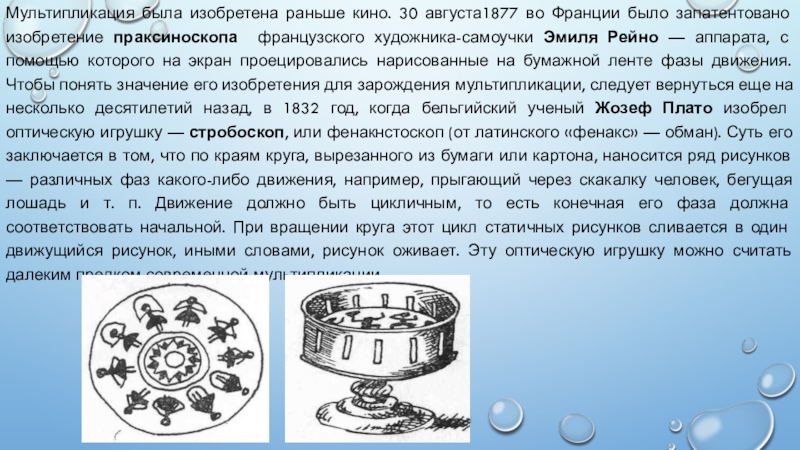 изобретение праксиноскопа французского художника-самоучки Эмиля Рейно — аппарата, с помощью которого на экран проецировались нарисованные на бумажной ленте фазы движения. Чтобы понять значение его изобретения для зарождения мультипликации, следует вернуться еще на несколько десятилетий назад, в 1832 год, когда бельгийский ученый Жозеф Плато изобрел оптическую игрушку — стробоскоп, или фенакнстоскоп (от латинского «фенакс» — обман). Суть его заключается в том, что по краям круга, вырезанного из бумаги или картона, наносится ряд рисунков — различных фаз какого-либо движения, например, прыгающий через скакалку человек, бегущая лошадь и т. п. Движение должно быть цикличным, то есть конечная его фаза должна соответствовать начальной. При вращении круга этот цикл статичных рисунков сливается в один движущийся рисунок, иными словами, рисунок оживает. Эту оптическую игрушку можно считать далеким предком современной мультипликации.