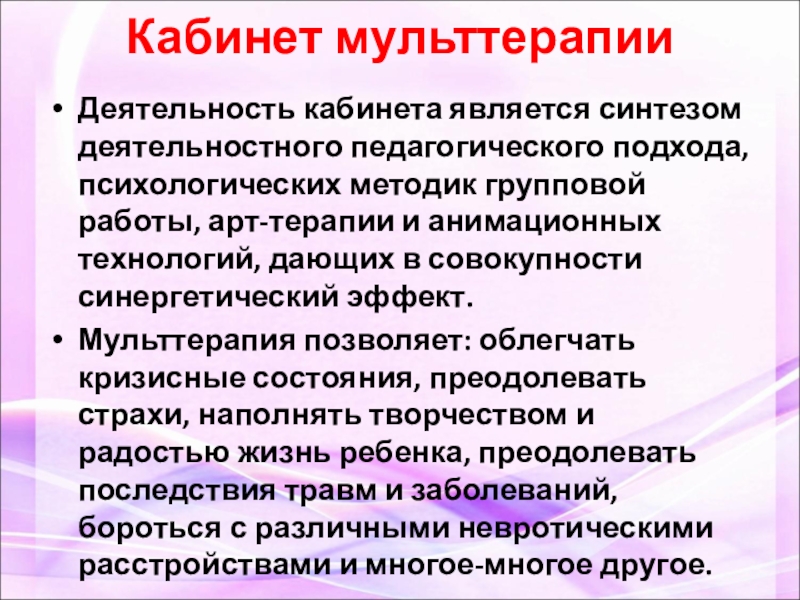 Деятельность кабинета является синтезом деятельностного педагогического подхода, психологических методик групповой