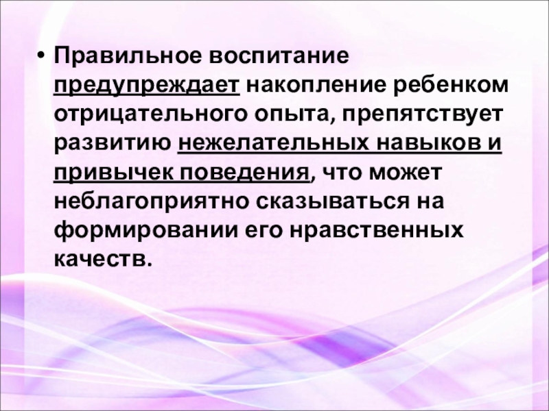 Слайд 7Правильное воспитание предупреждает накопление ребенком отрицательного опыта, препятствует развитию нежелательных навыков