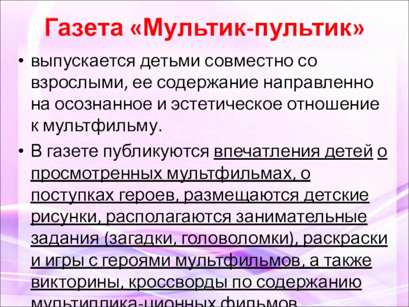 В газете публикуются впечатления детей о просмотренных мультфильмах, о поступках героев, размещаются детские рисунки, располагаются занимательные задания (загадки, головоломки), раскраски и игры с героями мультфильмов, а также викторины, кроссворды по содержанию мультиплика-ционных фильмов.