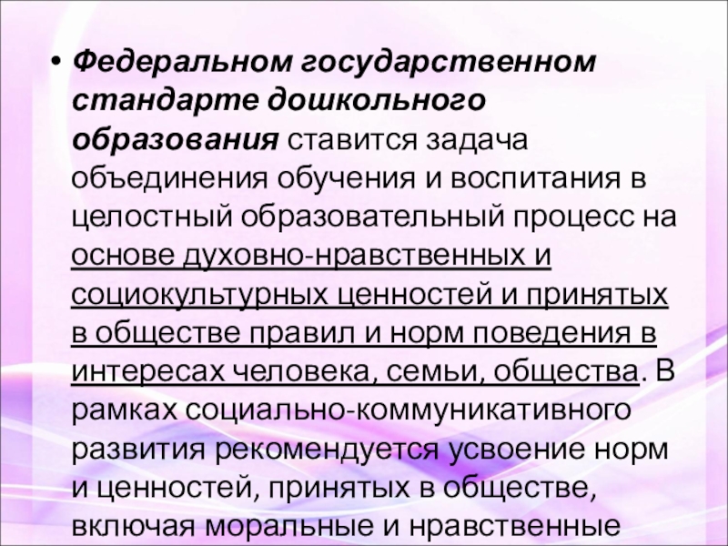в целостный образовательный процесс на основе духовно-нравственных и социокультурных ценностей и принятых в обществе правил и норм поведения в интересах человека, семьи, общества. В рамках социально-коммуникативного развития рекомендуется усвоение норм и ценностей, принятых в обществе, включая моральные и нравственные ценности