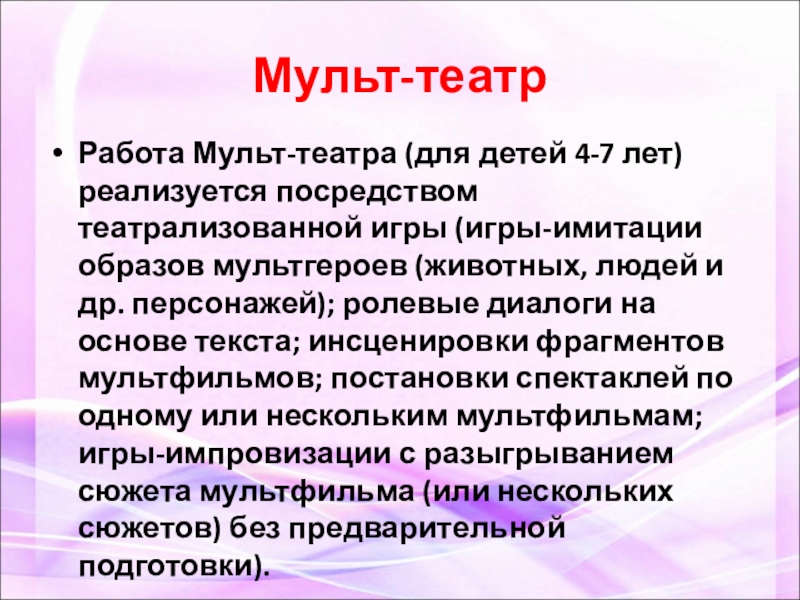 Работа Мульт-театра (для детей 4-7 лет) реализуется посредством театрализованной игры (игры-имитации