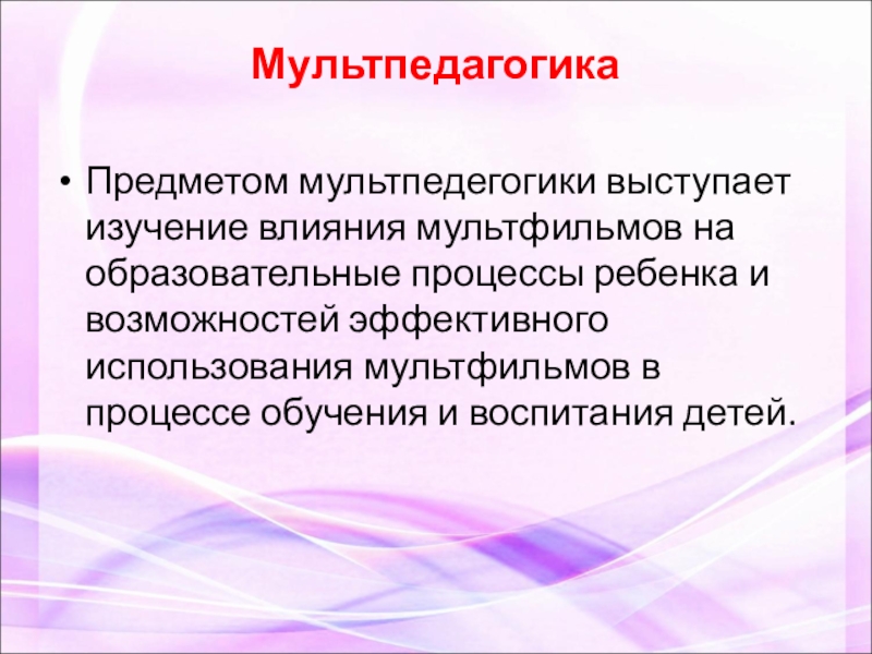 Предметом мультпедегогики выступает изучение влияния мультфильмов на образовательные процессы ребенка и