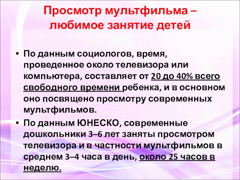 По данным ЮНЕСКО, современные дошкольники 3–6 лет заняты просмотром телевизора и в частности мультфильмов в среднем 3–4 часа в день, около 25 часов в неделю.