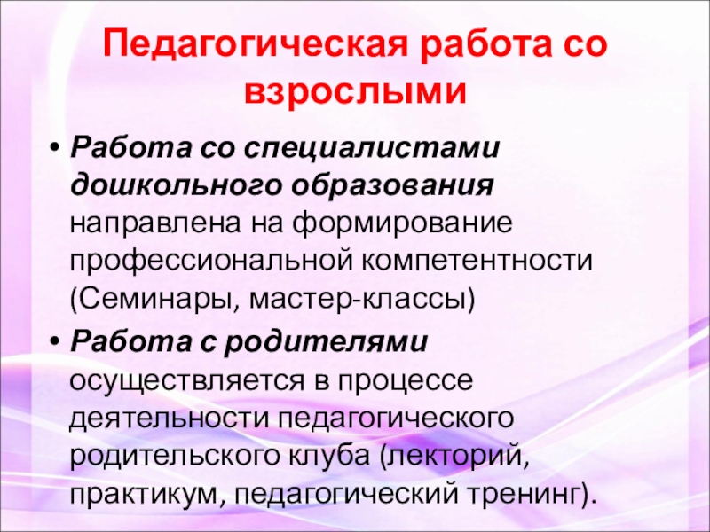 Работа с родителями осуществляется в процессе деятельности педагогического родительского клуба (лекторий, практикум, педагогический тренинг).