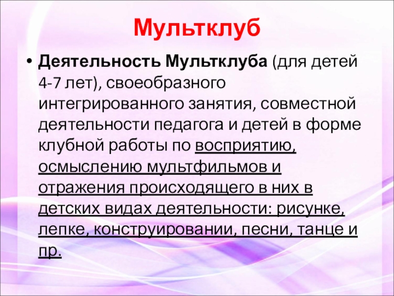 Деятельность Мультклуба (для детей 4-7 лет), своеобразного интегрированного занятия, совместной деятельности