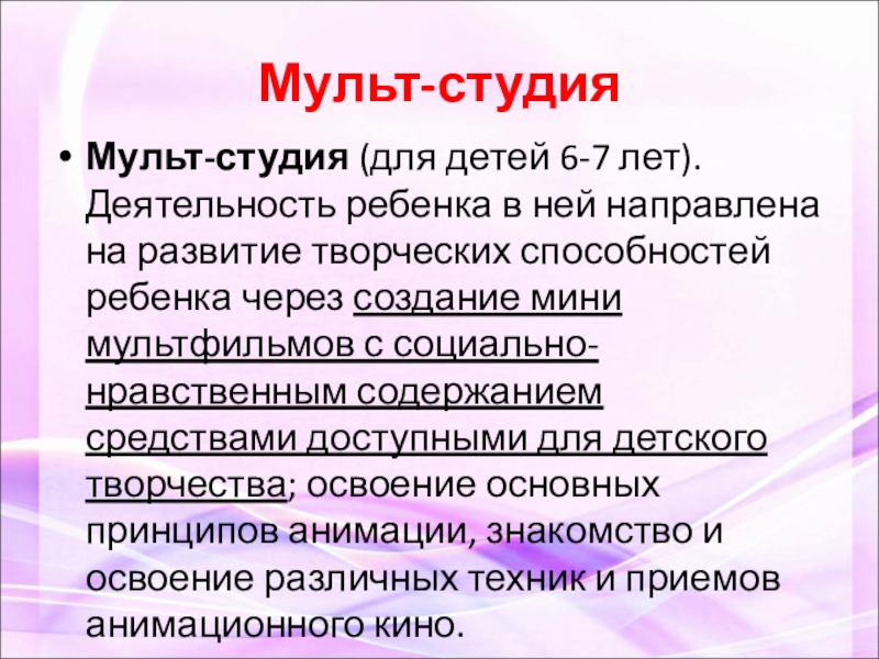 Мульт-студия (для детей 6-7 лет). Деятельность ребенка в ней направлена на