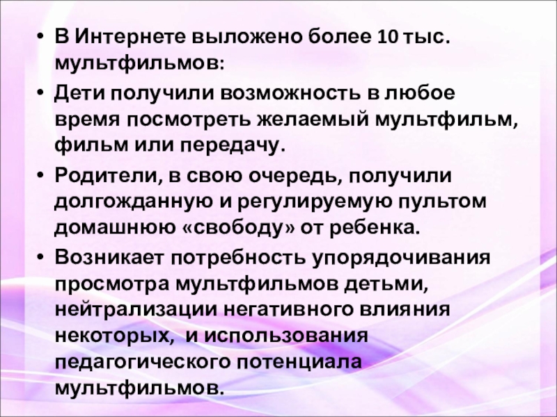 Возникает потребность упорядочивания просмотра мультфильмов детьми, нейтрализации негативного влияния некоторых, и использования педагогического потенциала мультфильмов.