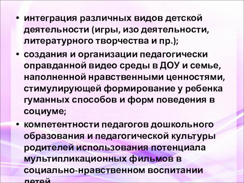 создания и организации педагогически оправданной видео среды в ДОУ и семье, наполненной нравственными ценностями, стимулирующей формирование у ребенка гуманных способов и форм поведения в социуме;