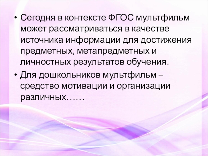 Слайд 14Сегодня в контексте ФГОС мультфильм может рассматриваться в качестве источника информации