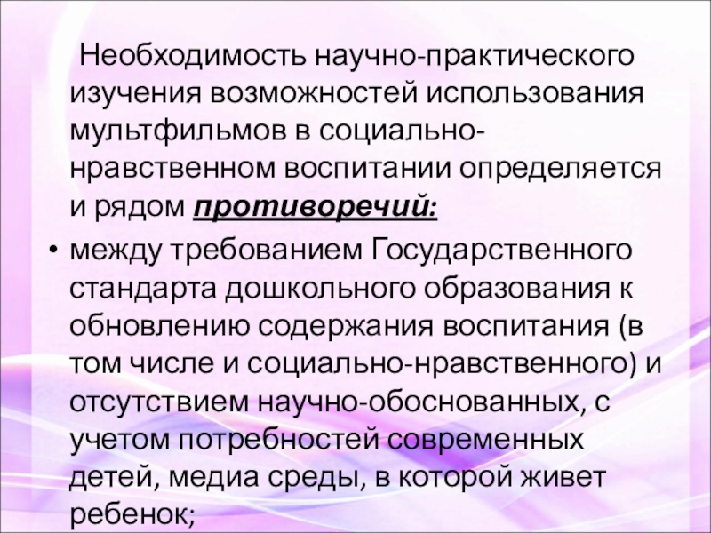 между требованием Государственного стандарта дошкольного образования к обновлению содержания воспитания (в том числе и социально-нравственного) и отсутствием научно-обоснованных, с учетом потребностей современных детей, медиа среды, в которой живет ребенок;