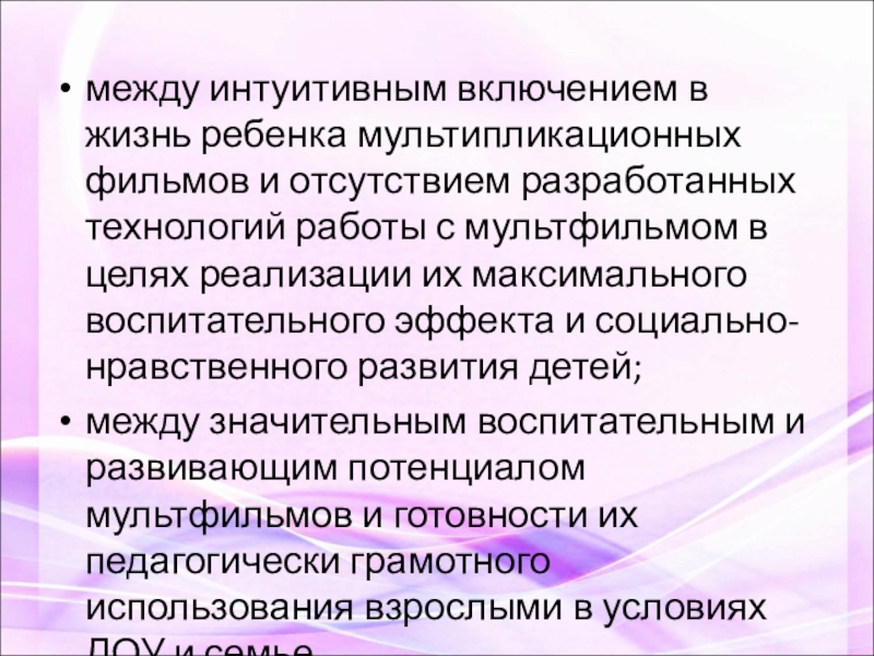 Слайд 16между интуитивным включением в жизнь ребенка мультипликационных фильмов и отсутствием разработанных