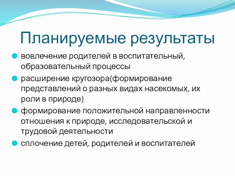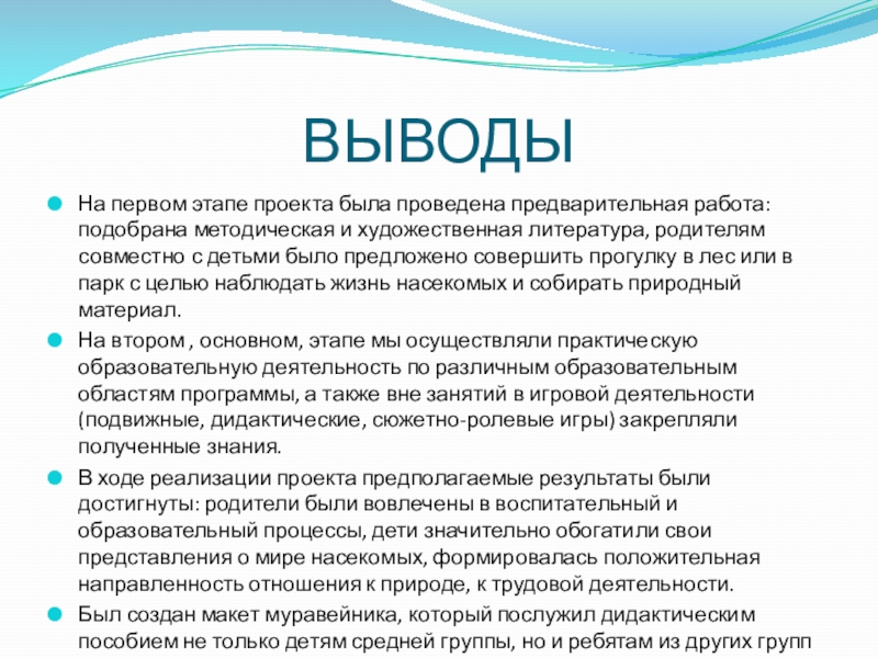 В ходе реализации проекта предполагаемые результаты были достигнуты: родители были вовлечены в воспитательный и образовательный процессы, дети значительно обогатили свои представления о мире насекомых, формировалась положительная направленность отношения к природе, к трудовой деятельности.