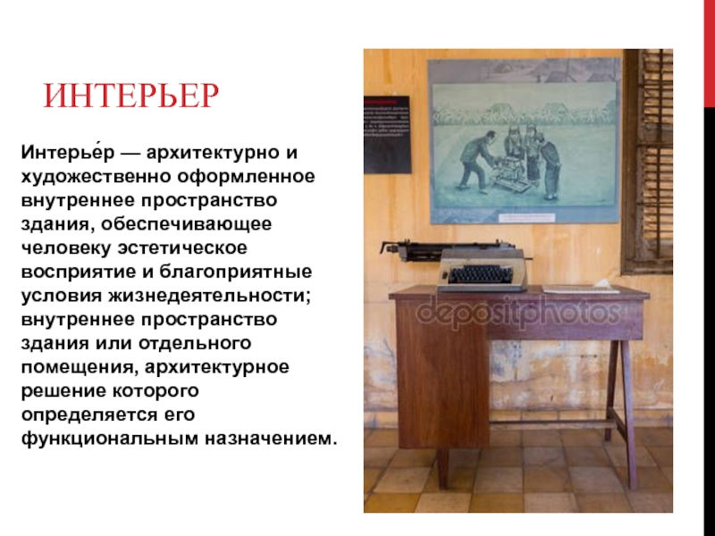 ИнтерьерИнтерье́р — архитектурно и художественно оформленное внутреннее пространство здания, обеспечивающее человеку эстетическое восприятие и благоприятные условия жизнедеятельности;
