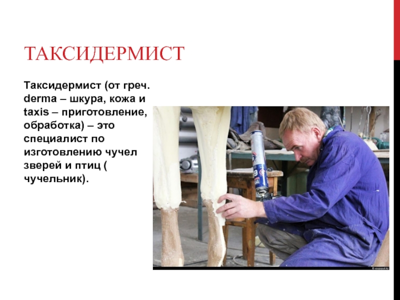 таксидермистТаксидермист (от греч. derma – шкура, кожа и taxis – приготовление, обработка) – это специалист по изготовлению