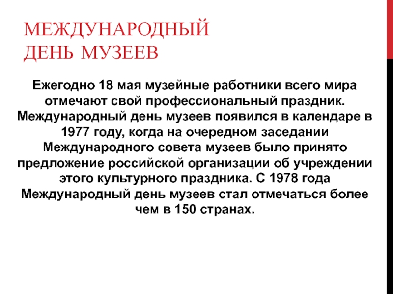 профессиональный праздник. Международный день музеев появился в календаре в 1977 году, когда на очередном заседании Международного совета музеев было принято предложение российской организации об учреждении этого культурного праздника. С 1978 года Международный день музеев стал отмечаться более чем в 150 странах.