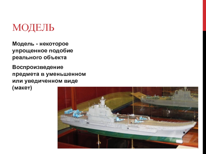 модельМодель - некоторое упрощенное подобие реального объектаВоспроизведение предмета в уменьшенном или уведиченном виде (макет)