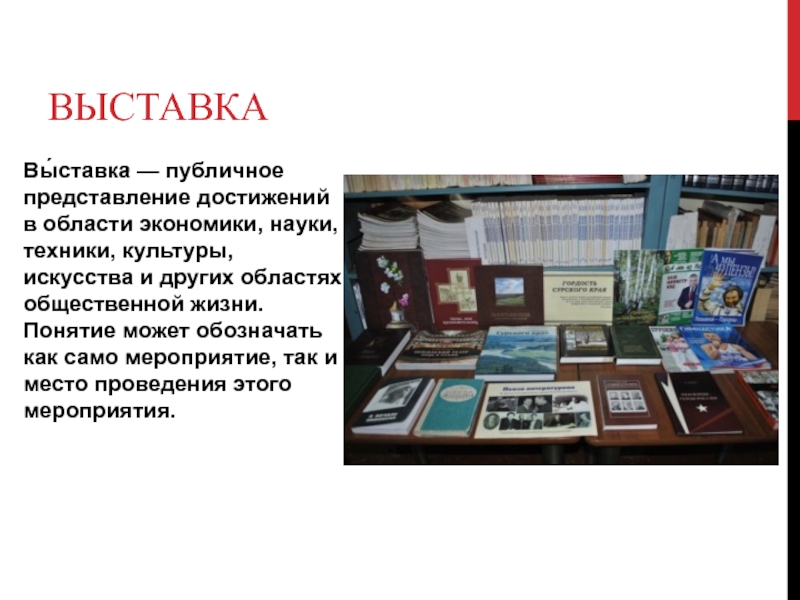 выставкаВы́ставка — публичное представление достижений в области экономики, науки, техники, культуры, искусства и других областях общественной жизни.