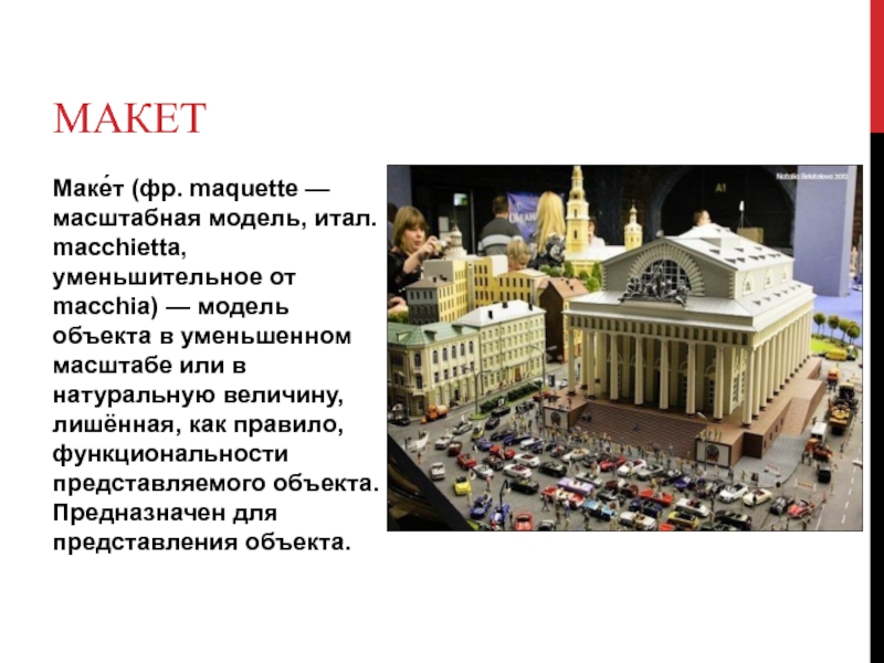 макетМаке́т (фр. maquette — масштабная модель, итал. macchietta, уменьшительное от macchia) — модель объекта в уменьшенном масштабе