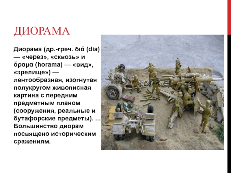 «вид», «зрелище») — лентообразная, изогнутая полукругом живописная картина с передним предметным планом (сооружения, реальные и бутафорские предметы). ... Большинство диорам посвящено историческим сражениям.