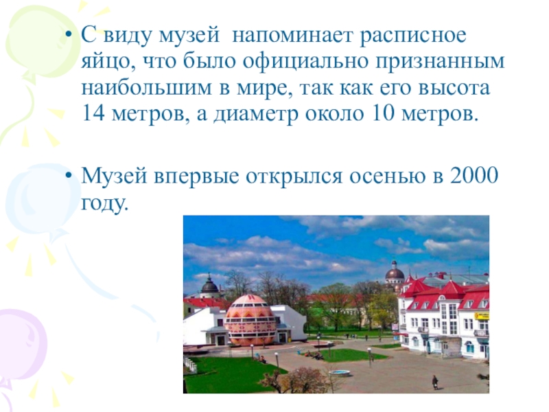 Слайд 6С виду музей напоминает расписное яйцо, что было официально признанным наибольшим
