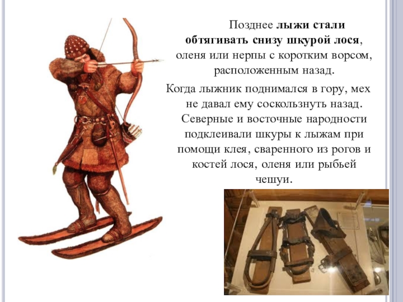 Позднее лыжи стали обтягивать снизу шкурой лося, оленя или нерпы с