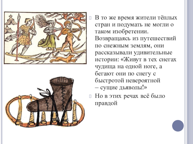 о таком изобретении. Возвращаясь из путешествий по снежным землям, они рассказывали удивительные истории: «Живут в тех снегах чудища на одной ноге, а бегают они по снегу с быстротой невероятной – сущие дьяволы!»